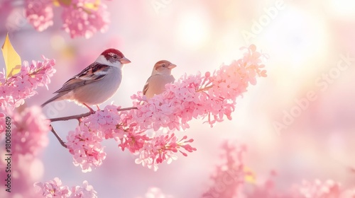 39.Sparrows perched on a tree branch near a blooming lilac bush, with the soft pink flowers in full bloom around them. The scene captures the beauty of spring, with the birds calmly observing their