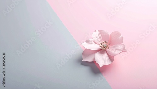 柔らかなピンクグレーのグラデーション背景に、フローラルブローチを一つだけ置いた、洗練されたフェミニンミニマル写真です。 淡く優しい光が花のディテールと上品な立体感を引き立てます。