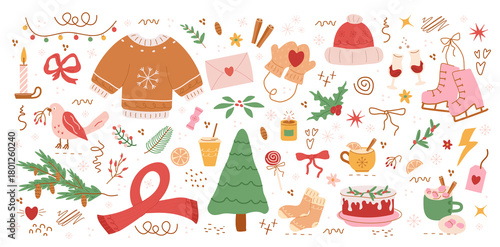 Retro vintage, concept winter, pattern, Fir tree, stars, dots, snow, line drawing. Holiday design elements are isolated on pink background. Simple shape conceptfor winter season cards for party. png