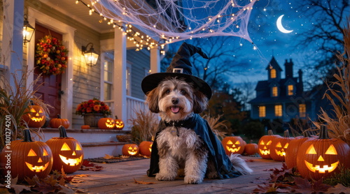 Ulubiony pupil w święto halloween. doskonały strój, characteryzacja i świąteczna sceneria. Ulubione zwiarzątko w przebraniu.
