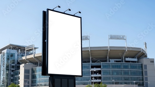 Standing vertical black outline billboard with clear white display outside a football stadium,