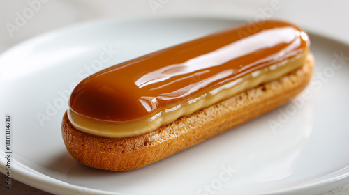白い皿に置かれたつややかなキャラメルグレーズをまとった風味豊かなエクレアの洗練されたクローズアップ
