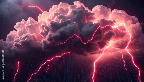 Cybernetic storm clouds with glowing neon lightning, digital rain of binary codes, dark futuristic background, highly detailed 2