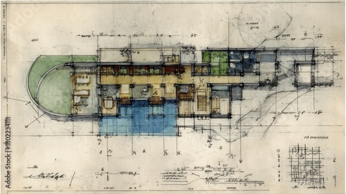 Architectural floor plan showing a detailed. Hand drawn design with watercolor washes outlining individual rooms and an outdoor area