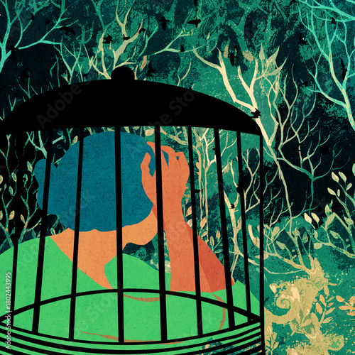 Ilustracja młoda kobieta w czarnej klatce na tle ciemnego otoczenia.