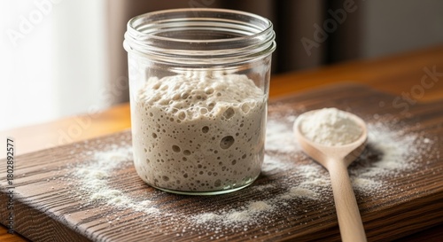 In a bright kitchen, a glass jar holds a bubbling sourdough starter resting on a wooden cutting board. Flour is scattered around, and a wooden spoon sits next to the jar, ready for baking.