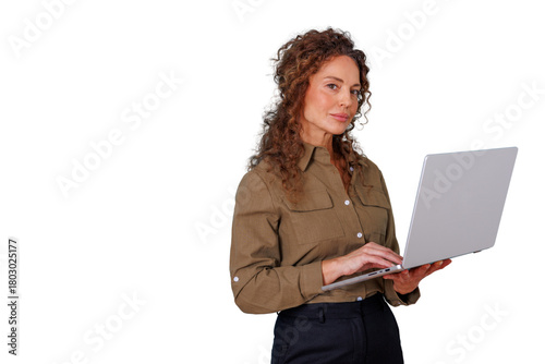 Businesswoman standing, holding and working on laptop, looking at camera, displaying confidence and professionalism
