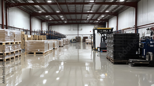 An industrial warehouse with a durable, high-gloss epoxy floor, with pallets and machinery lined up neatly, showcasing the practical and tough nature of the floor