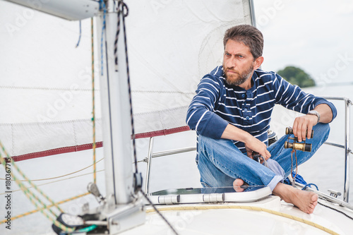 man sits on bow of sailing yacht and holds binoculars
