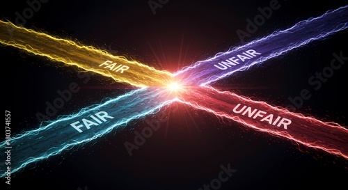 Colorful lightning bolts intersecting at the center, symbolizing fairness and unfairness in society
