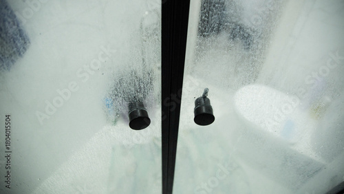 White marks and hard water stains on the transparent shower doors in the bathroom. Unsanitary and Hygiene Cleaning Solution, industry