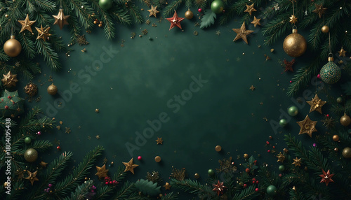 Ciemnozielone tło ze świąteczną dekoracją i pustym miejscem na tekst