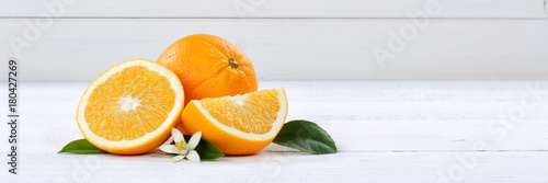 Frische Orangen Orange Frucht Früchte Banner Textfreiraum Holzbrett
