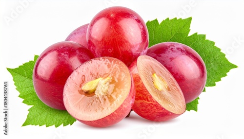 Ripe red and pink grape bunch with green leaves, isolated on white background, full-depth