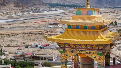Panoramic view to Leh valley with airport runway through intricate carved golden roof of Buddhist prayer wheel pavilion or Mani wheel for sacred spin. Ladakh Region, India