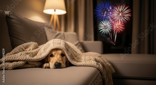 dog hiding under blanket on couch during colorful fireworks in living room at night
