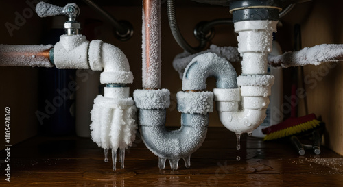 Frozen pipes under kitchen sink with frost and ice forming on plumbing. Frozen pipes create potential water damage issues and indicate low temperatures in home environment.