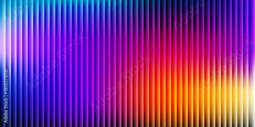 Glass ripple texture with dark gradient background and vivid orange, blue, and lilac light streaks. Futuristic distortion, moody abstract glow, reeded vertical blur. Vector illustration