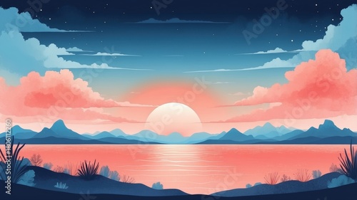 Stylized Sunset Landscape Background. Pink and Blue Gradient Sky with Clouds. Watercolor Horizon Illustration for Summer or Travel