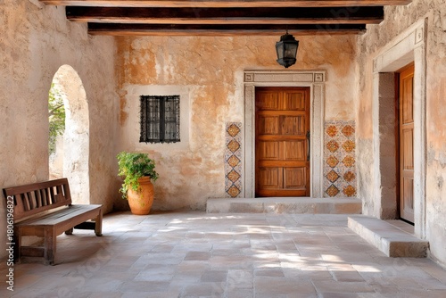 Spanish Colonial Hacienda courtyard architecture with wooden door