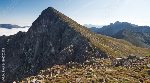 View from Pic mountain peak in Pyrenees mountains in Andorra during summer morning