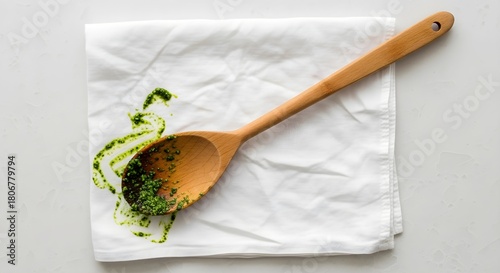 A wooden spoon coated with pesto rests on a white cloth creating a stain.