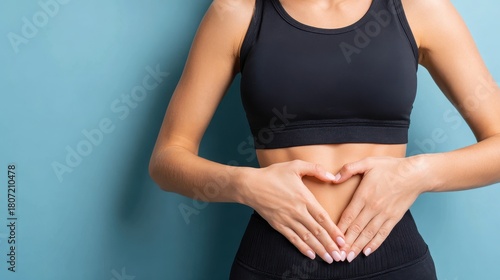 Portrait of a woman with a heart shaped hand gesture on her stomach emphasizing gut health and wellness against a blue backdrop Focus on weight loss fitness and self care in a studio