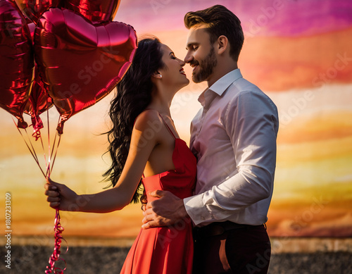 Obejmująca się zakochana para z czerwonymi balonami w kształcie serca. Miłość, zakochanie, walentynki