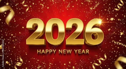 Golden 2026 numbers with happy new year text and falling confetti on red background