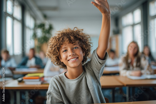 Uczeń podnosi rękę na lekcji, aby zadać pytanie nauczycielowi