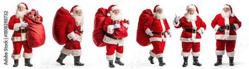 Santa Claus with a red sack of gifts, walking and standing in various poses.