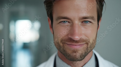 Dedicated Physician's Gaze: An up-close portrait of a confident and skilled physician, his eyes reflecting empathy and expertise, a symbol of trust and care.