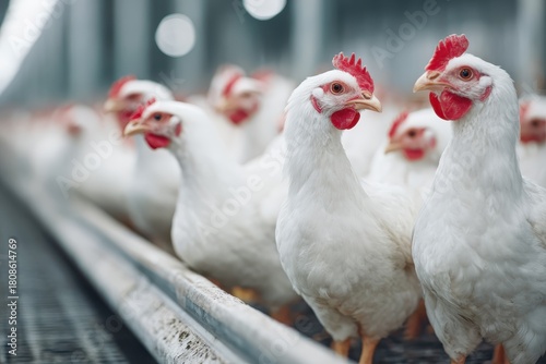 Group of white hens gathered together in a clean and spacious environment during daytime in a poultry farm