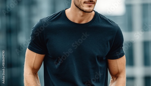 Athletic man wearing a fitted black t-shirt stands confidently outdoors, showcasing a strong physique against a modern urban backdrop, exuding style and charisma