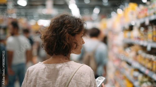 Young woman standing in a supermarket aisle, looking at the shelves. she is wearing a beige striped top and has shoulder-length curly hair.