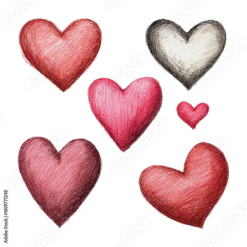A collection of illustrated hearts in varying shades of red and a single grey heart arranged against a black background highlighting their sketched texture and romantic symbolism