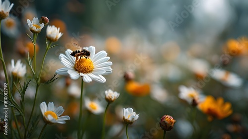 Bumblebee collecting pollen on white daisy in spring meadow.Macro close-up of bumblebee resting on chamomile flower