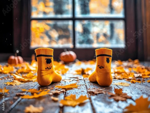 A charming autumn scene featuring two yellow socks with festive jack-o'-lantern faces and paw prints, resting on a rustic wooden floor amidst scattered fall lea