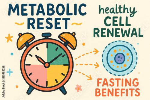 Playful metabolic reset graphic with colorful clock showing fasting benefits. This visual concept for healthy cell renewal promotes wellness and rejuvenation through diet plan