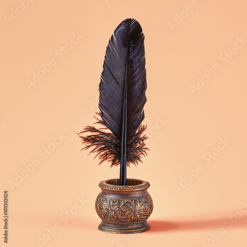 Elegant black feather quill in a decorative stand poised for writing on a soft peach background.