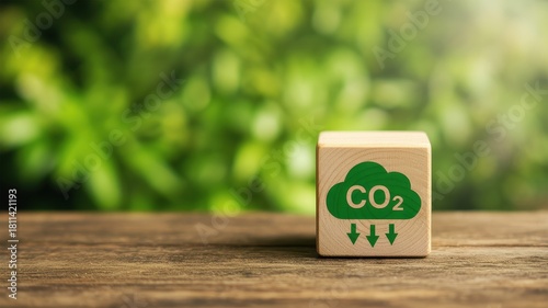 Wooden cube displaying co2 emissions reduction with blurred green background