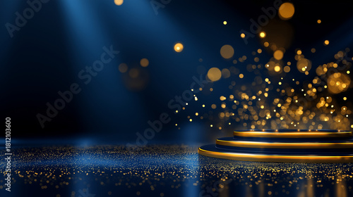 Dark blue stage with golden spotlight lines faceless award ceremony design defocused glitter texture background realistic 3D abstract premium elegant glamour anniversary