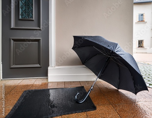 a sleek wet umbrella is propped against a dampened wall near a sodden doormat after a rain shower