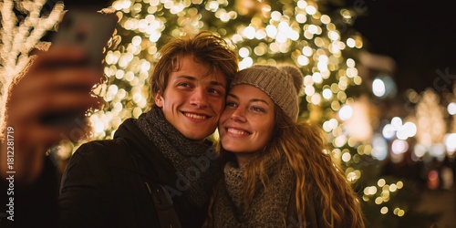 Young couple in knit hats and scarves take selfie smiling before massive glowing Christmas tree bokeh. Romantic urban holiday moment, magical winter love vibe.
