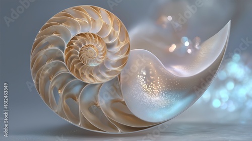 螺旋状の部屋を持つオウムガイの貝殻の断面図。パールとゴールドの色調で輝く幻想的な構造。 | Cross-section of a nautilus shell with spiral chambers. Ethereal structure glowing in pearl and gold tones.