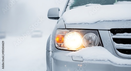 Car headlight illuminated in heavy snowfall with snow-covered hood winter driving