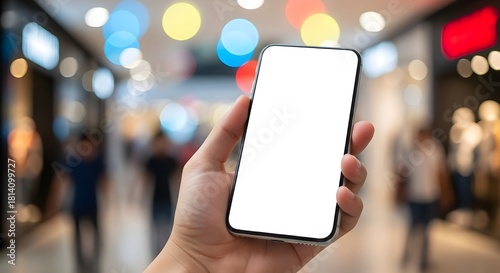 Cerrar la mano usando un teléfono inteligente en el fondo del centro comercial