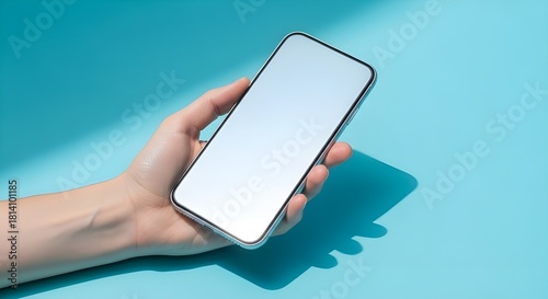 Las manos de una mujer sostienen con gracia un teléfono inteligente contra un fondo azul suave.