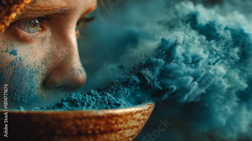 Intensywne zbliżenie na część twarzy osoby z jasnoniebieskimi oczami i pomarańczowym nakryciem głowy, zasłoniętej niebieskim, sproszkowanym pyłem.
