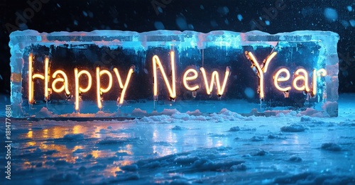 Frozen text spells Happy New Year. Bright orange illumination contrasts cool blue ice. Snowflakes fall upon reflective surface.